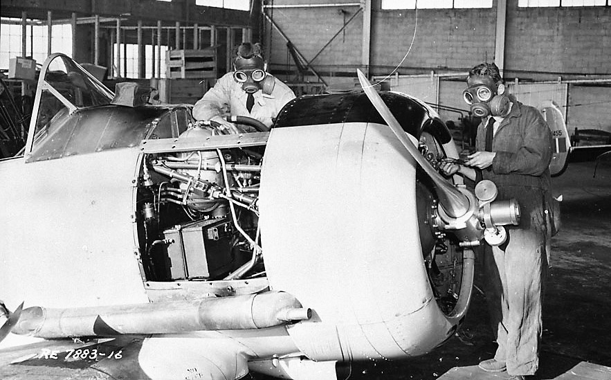 North American Harvard Mk. IV, being worked on by Fitters wearing respirators, 8 Dec 1953.