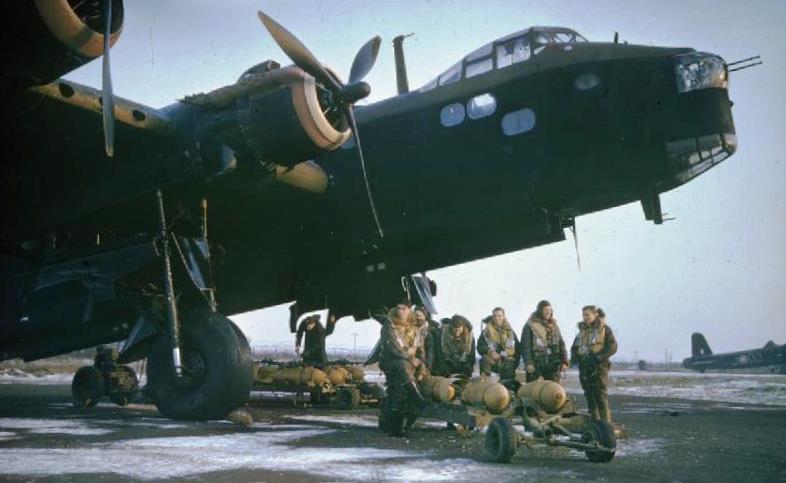 Short Stirling Mk/ I (Serial No. W7455), coded OJ-B, No 149 Squadron, RAF, with its 7-man crew under the nose, waiting while their aircraft is being bombed-up. RAF Waterbeach.