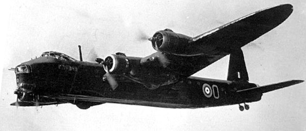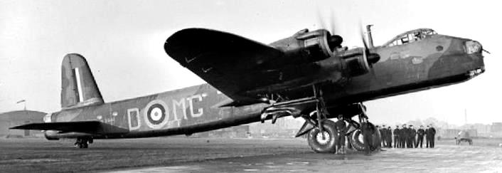 The Short Stirling was the first British four-engined bomber in service during the Second World War, entering RAF Squadrons early in 1941.  Many were flown with RCAF aircrews during the war.  It was powered by four Bristol Hercules Mk. XVI air-cooled radial piston engines, and flown with a seven-man crew. It had a maximum speed of 435 km/h (270 mph) at 4,420 metres (14,500 feet), a range of 3,235 km (2,010 miles), with a 1,588 kg (3,500 lb) bomb load. It was armed with eight .303-inch Browning machine guns, with two in the nose, two in the mid-upper dorsal turret and four in the rear turret. It could carry a bombload of 6,350 kg (14,000 lb) in the lower fuselage and wing cenre section.