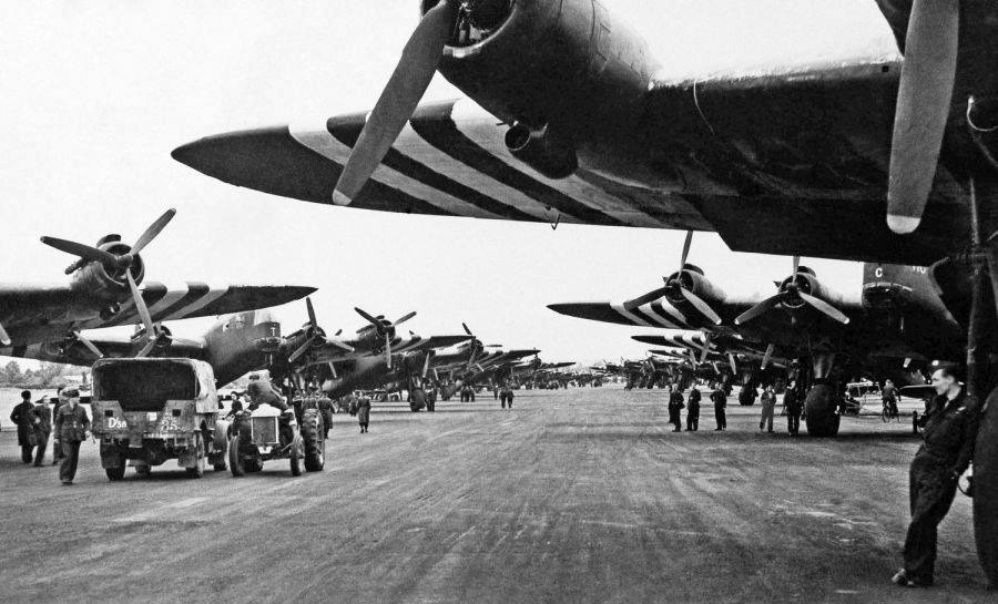 Short Stirling fleet in D-Day invasion stripes, lined up in preparation to serve as glider tugs and supply aircraft during the Allied invasion of Europe in June 1944.