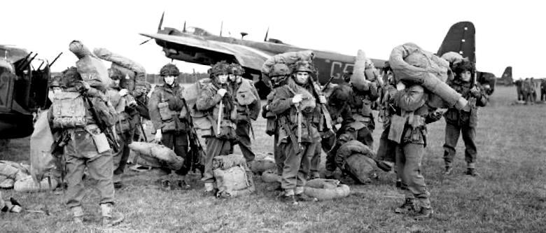 British airborne troops just disembarked from a Short Stirling, coded C5–, at Gardermoen airfield near Oslo, Norway.
