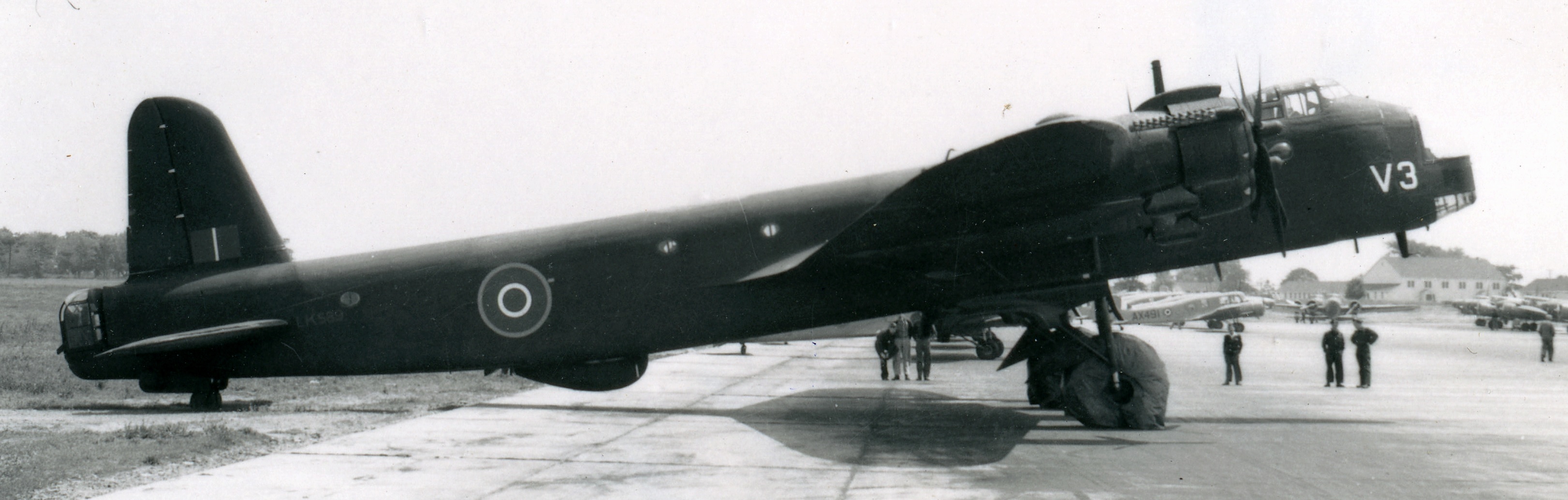 In June 1944, this Short S.29 Stirling B Mk. IV (Serial No. LK589), coded V3, RAF, was flown across the Atlantic as part of a navigation training exercise and did a tour of bases in Eastern Canada. It is shown here at Malton, Ontario.  It was flown back to the UK after a two-week visit. (L. Faux Photos)