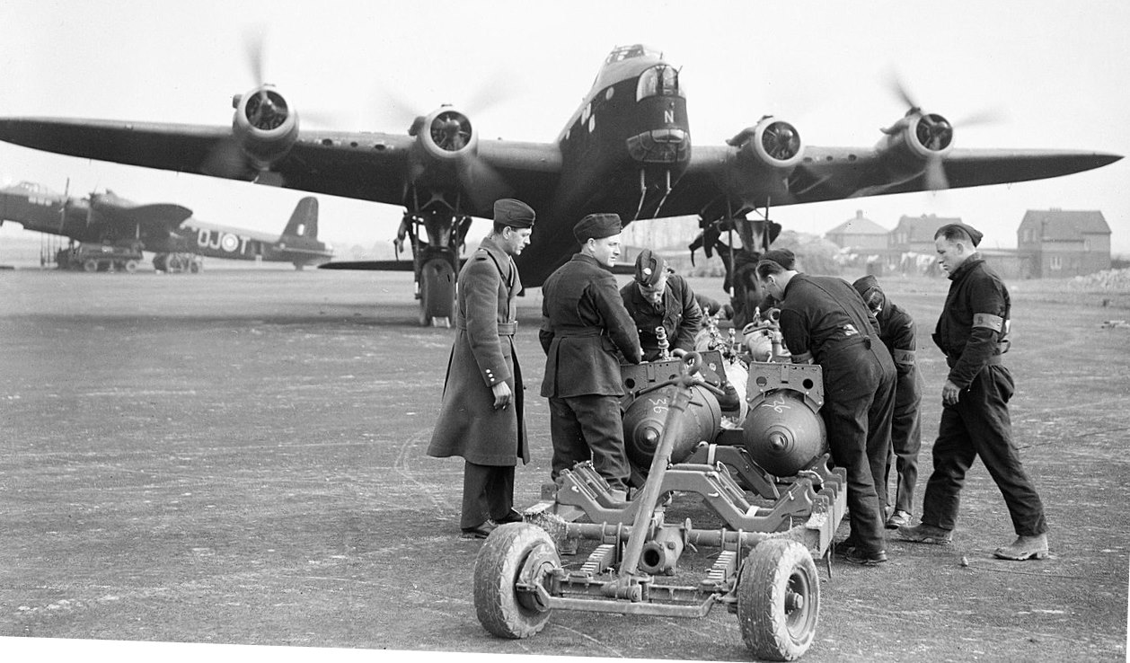 Short Stirling, coded N-Nuts running up its engines at Mildenhall, UK as armourers of No. 19 Squadron fit bomb carriers to a pair of 1,000-pounders, 10 March 1942.