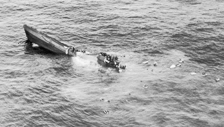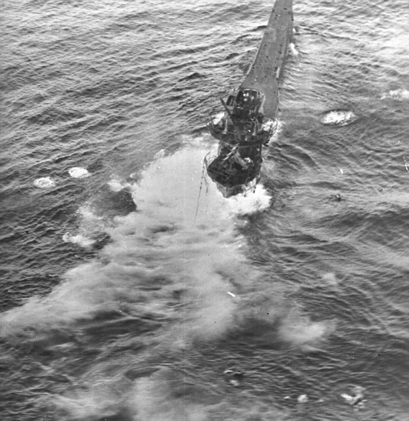 Coastal Command’s first U-boat kill of 1944. The Sunderland’s gunners put a final burst of fire across the U-boat’ six and a half minutes after the first sighting; a few seconds later the U-boat disappeared beneath the surface. Survivors can be seen in the water at the bottom right of the photo.
