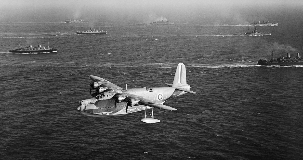 Short Sunderland Mk. I flying boat, coded DA-G, of No. 210 Squadron RAF based at Oban in Scotland, patrols over a Canadian troop convoy on its way to Greenock, 31 July 1940.