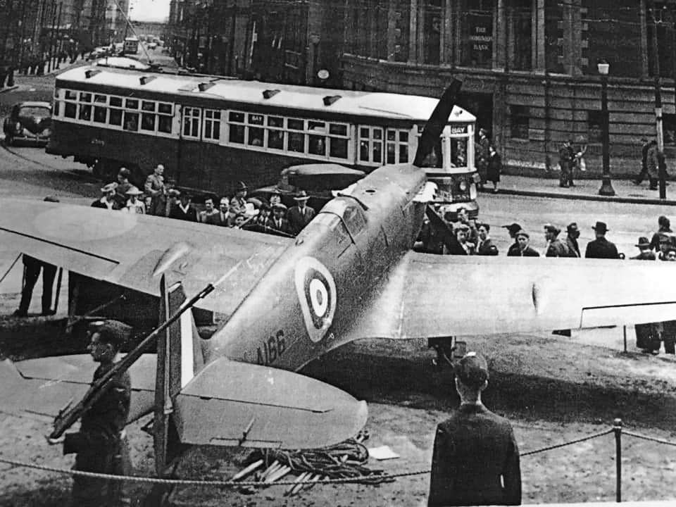 Supermarine Spitfire F Mk. IIB, RCAF (Serial No. P8332), painted -A166, at old city hall Toronto, Ontario, ca 1943.
