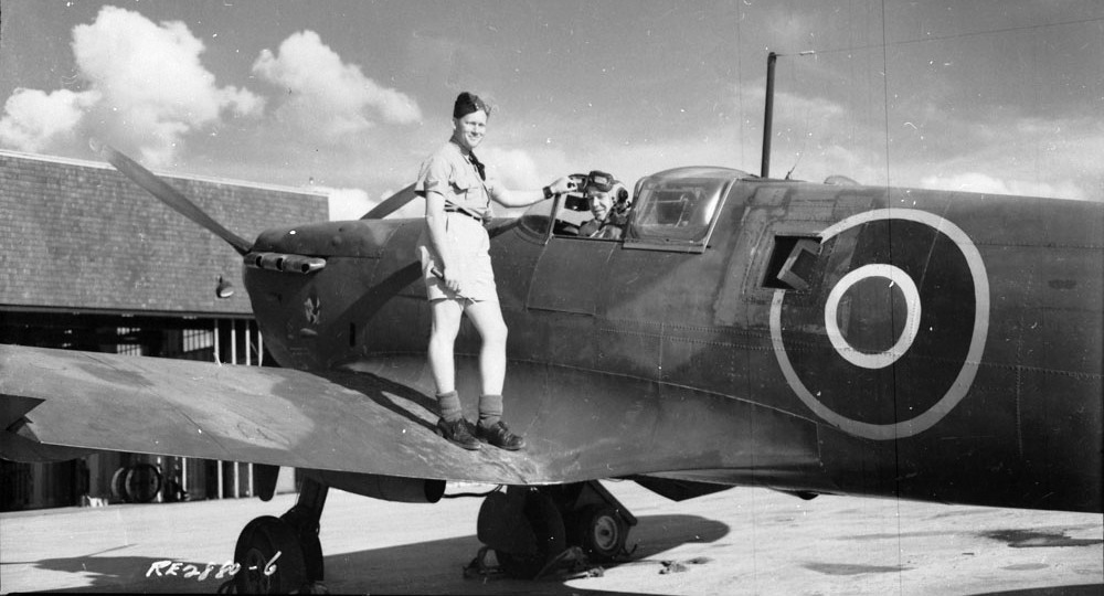 Operation Eclipse aircrew, (Tom Percival on the left) with Supermarine Spitfire Mk. VI, RCAF (Serial No. X4492), 20 August 1945.