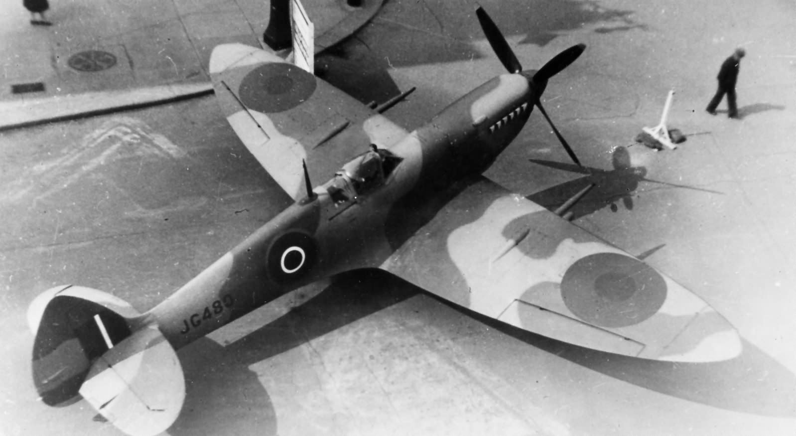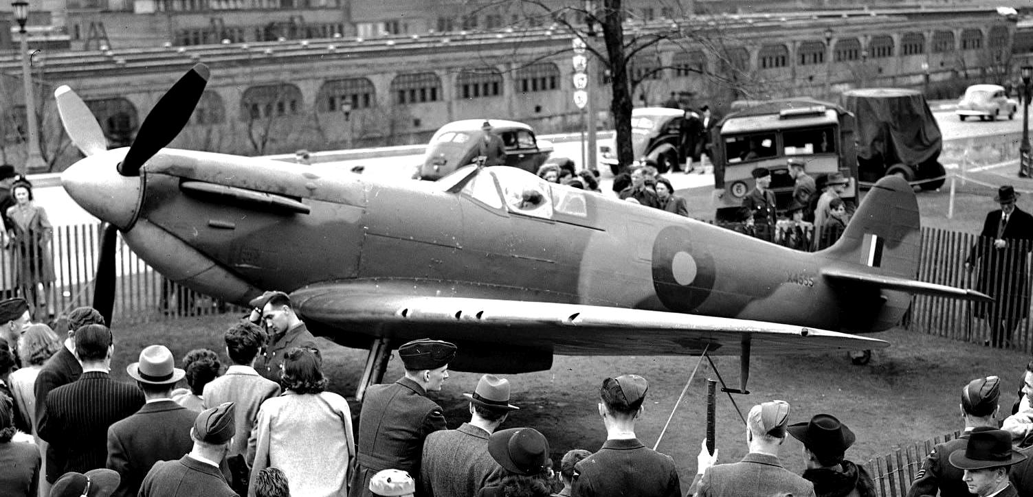 Supermarine Spitfire PR Mk. VII, RCAF (Serial No. X4555), in its original PRU scheme, on display in a May 1943 Victory Drive, Ottawa, Ontario.