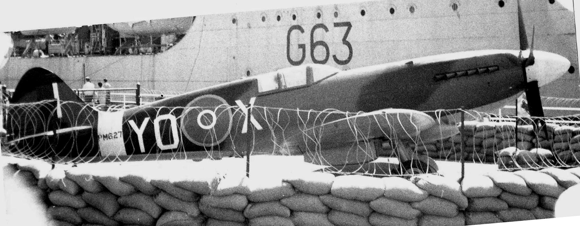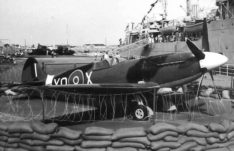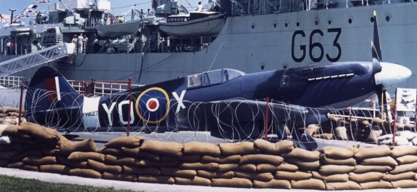 Supermarine Spitfire PR Mk. XIX, RCAF (Serial No. PM627), coded YO-X, Toronto, Ontario, alongside HMCS Haida, ca 1972, now in Sweden. This Spitfire was delivered to the Royal Air Force as in 1945, and served until it was struck off strength in 1951. It was transferred to the Indian Air Force as (Serial No. HS964) in 1953 and served until it was struck off strength in 1957. It went on display in the Indian AF Museum, Palam AB, New Dehli, India, from 1957-1971. This Spitfire was acquired by John Weir with the Canadian Fighter Pilots Association, Downsview, Ontario, on 3 Feb 1971. The Spitfire arrived disassembled in a Lockheed C-130 Hercules. After undergoing a static restoration, it was displayed as (Serial No, PM627), coded YO-X & DB-X at the Canadian National Exhibit Grounds, Toronto, from 1972-1973, and at the Ontario Science Center, Toronto, Ontario, from Nov 1973-1978. It was later displayed at the Canadian Warplane Heritage Museum, Mount Hope, Ontario, in 1980. The Spitfire went to David C. Tallichet, MARC, Chino, California in 1982. It then went to the Flygvapenmuseum, Malmslatt, Sweden, in October 1982, where it is on display as RSwAF as Fv31051.