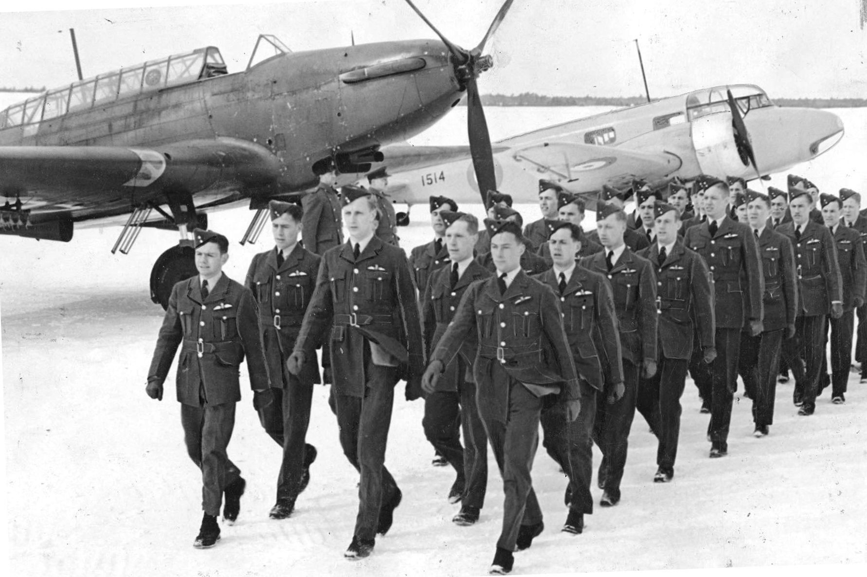 Fairey Battle and a twin-engine Airspeed Oxford Mk. I (Serial No. 1514), provide the background to an RCAF Wings parade at Camp Borden in 1944. These pilots received their flying training under the Commonwealth Air Training Plan.  They were among 133,554 pilots, observers, bomb aimers, navigators and flight engineers from all parts of the Commonwealth produced by the plan.