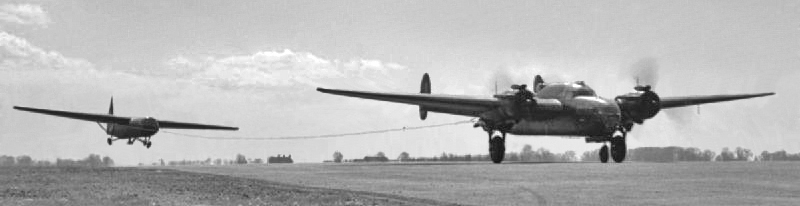 Armstrong Whitworth AW.41 Albemarle of No. 296 or 297 Squadron RAF, taking off from Brize Norton, Oxfordshire in the UK, towing an Airspeed Horsa Mk. I glider.