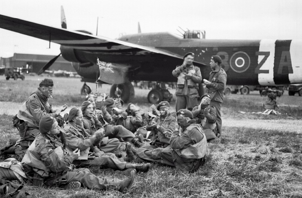 British Paratroopers preparing to board an Armstrong Whitworth AW.41 Albemarle coded BZ-A, in D-Day invasion stripes, 1944.