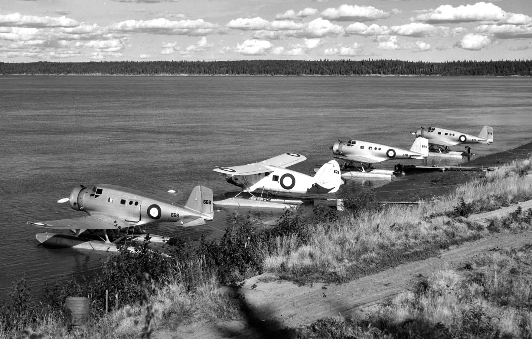 Three RCAF Northrop Delta Mk. Is (Serial Nos. 668, 670 and 673) and a Noorduyn Norseman, in the Ottawa River at Rockcliffe, Ontario.