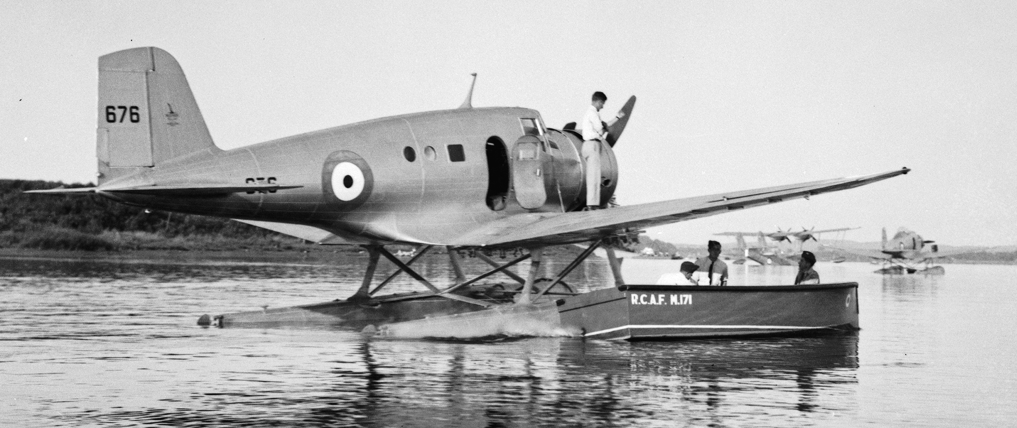 Northrop Delta Mk. II, RCAF (Serial No. 676), from No. 8 Squadron. It is shown being prepared for a flight from RCAF Station Rockcliffe, Ontario, to Sydney, Nova Scotia, on 26 Aug 1939. RCAF Marine Launch No. ML171 is being used to assist.