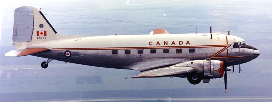 Origin of the RCAF fuselage flash: The RCAF wanted a distinct look for their transport aircraft so they came up with the lightning flash. It was trialed in 1948 on Dakota (Serial No. KJ936) at the Canadian National Exhibition (CNE) in Toronto, Ontario.  The public liked the design so it was adopted and approved on 8 Jan 1949. (Page 31 of Patrick Martin’s Royal Canadian Air Force Aircraft Finish and Markings 1947-1968).