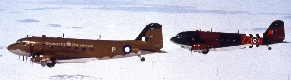 Douglas CC-129 Dakotas from No. 402 “City of Winnipeg” Squadron that went on a road trip across Canada in 1989 to help celebrate the retirement of the type from Canadian military service.  Douglas CC-129 Dakota (Serial No. 12963) was nicknamed “Manitoba Flyer“, and painted in the colours of the Second World War “‘Canucks Unlimited”, (Serial No. FZ658/P).  Douglas CC-129 Dakota (Serial No. 12944) nicknamed “¼ Time” was painted in the colours of the Second World War (Serial No. FZ671), coded Z2-B, including D-Day stripes.
