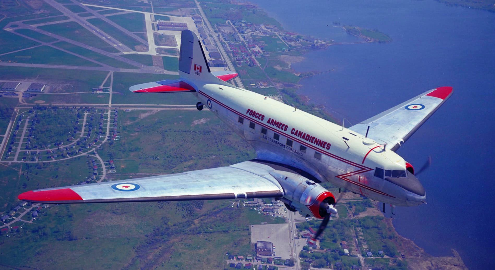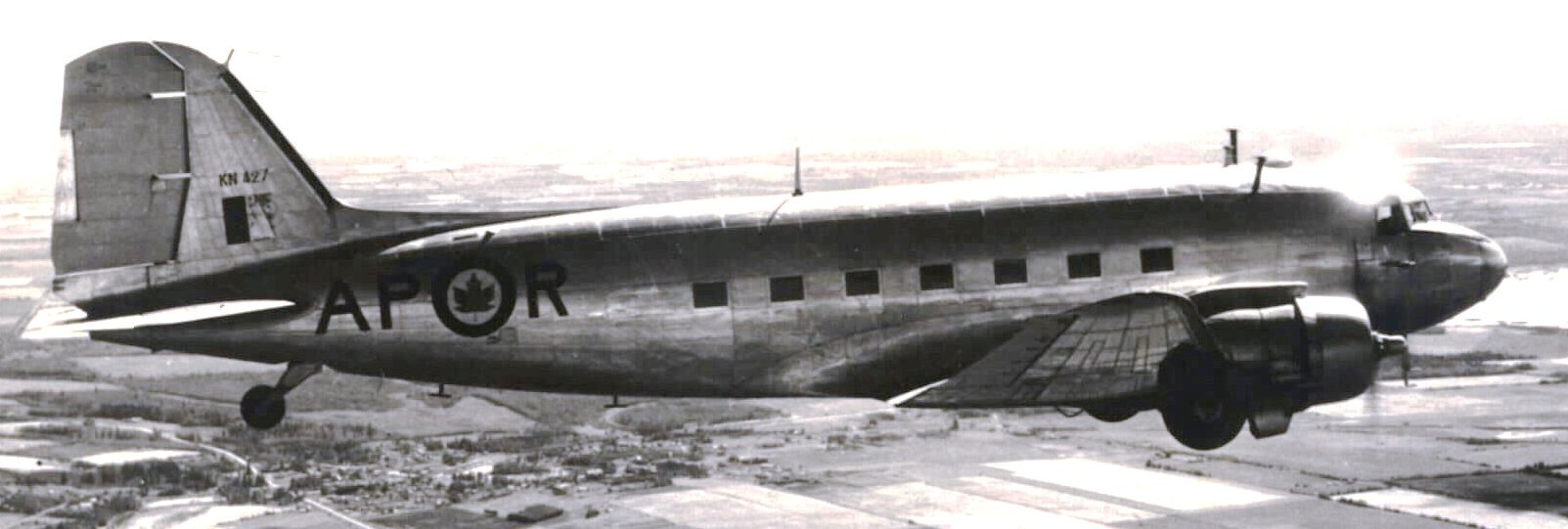 Douglas Dakota Mk. IV (Serial No.), over RCAF Station Trenton, Ontario.
