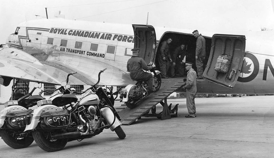 Douglas Dakota, with  RCMP Royal Outriders loading their motorcycles at Rockcliffe, before 1953.