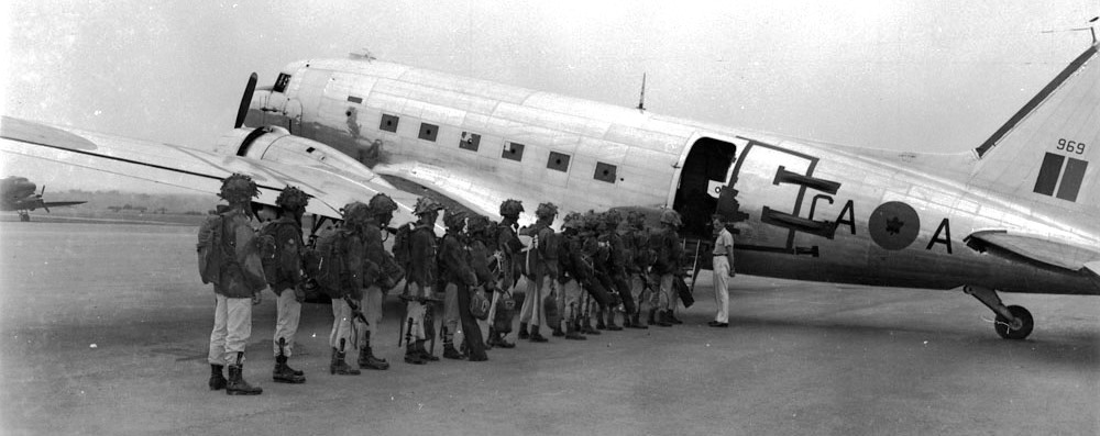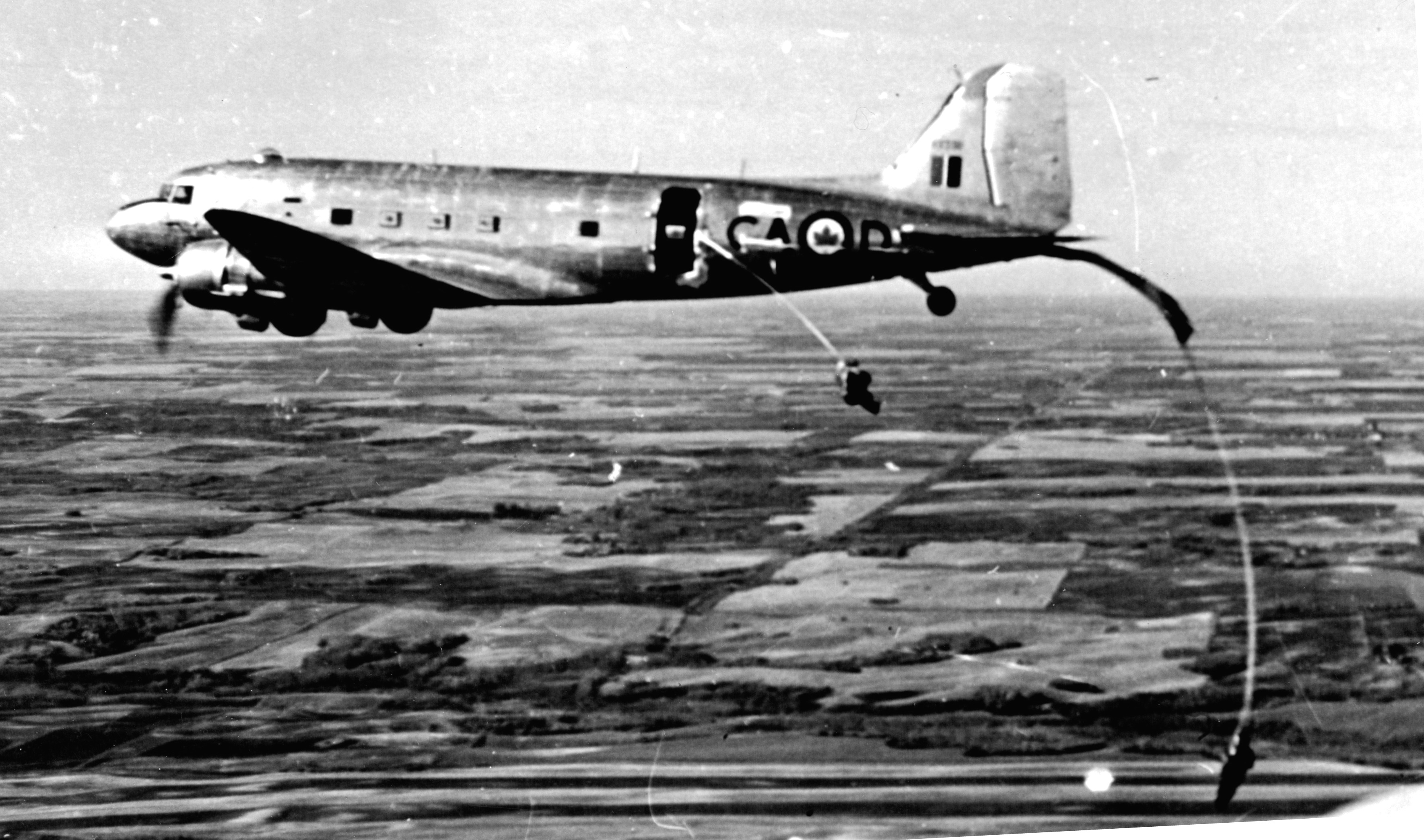 Douglas Dakota Mk. 4F, coded CA-D, dropping Princess Patricia’s Canadian Light Infantry (PPCLI) paratroopers over Rivers, Manitoba ca 1948.  The PPCLI paratroopers jumping are members of the  Mobile Strike Force (MSF).  (PPCLI Museum and Archives, The Military Museums, Calgary, Alberta)