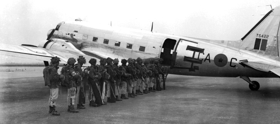 Canadian paratrooper exiting Douglas Dakota Mk. IV (Serial No. TS422), coded CA-C, c1948.