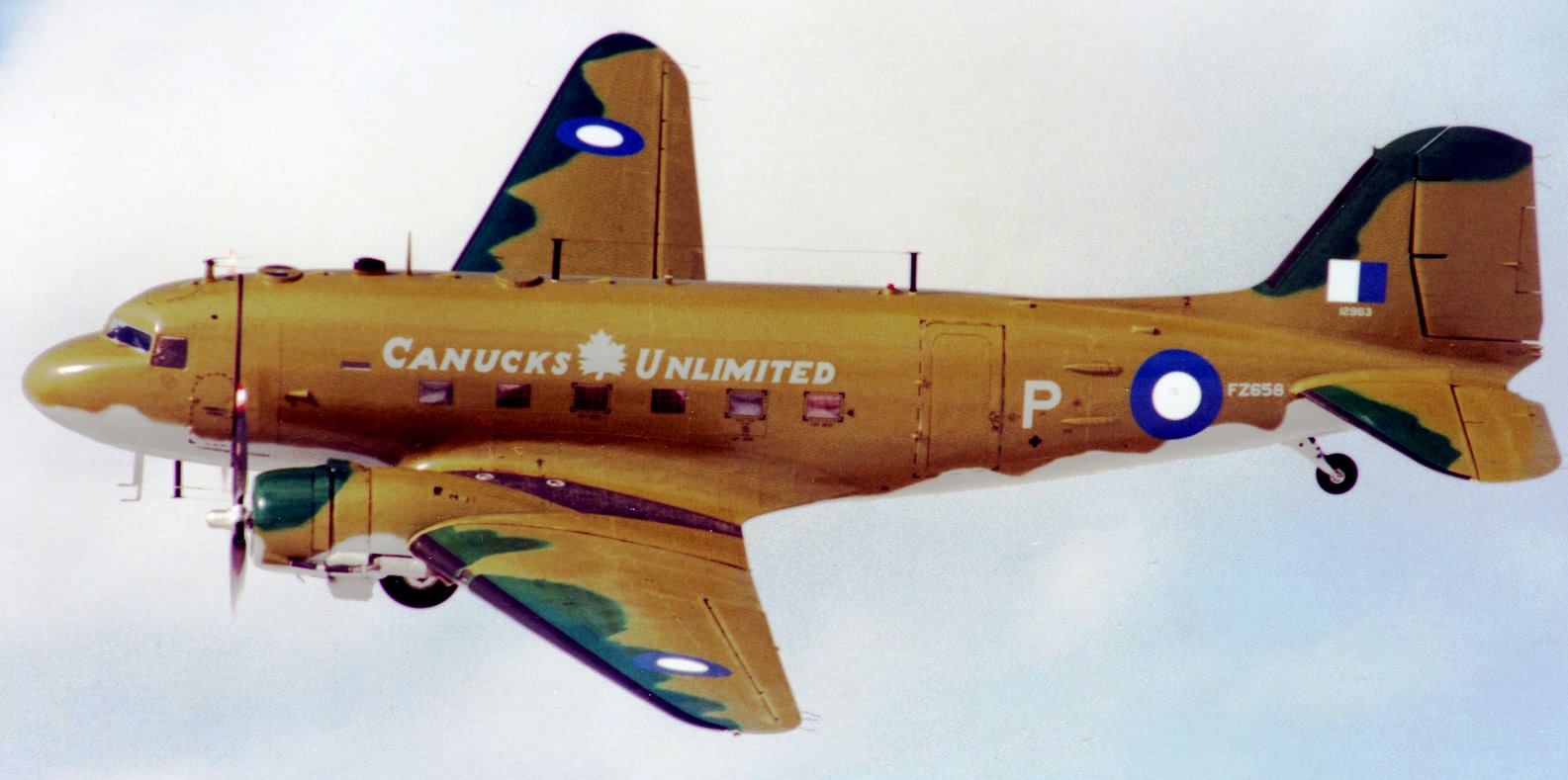 Douglas Dakota (Serial No. 12963) was nicknamed “Manitoba Flyer“, and painted in the colours of the Second World War “‘Canucks Unlimited”, (Serial No. FZ658/P).