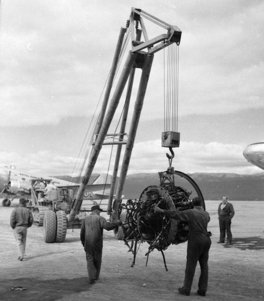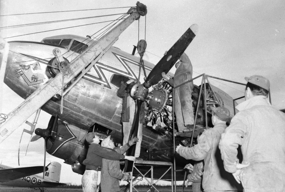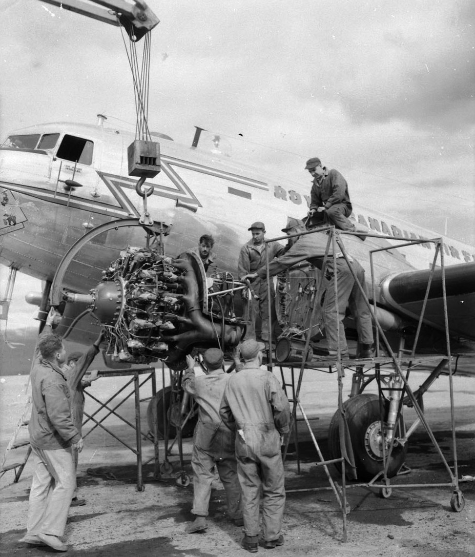 Douglas Dakota Mk. IV, RCAF, port engine change, Norman Wells, July 1950.