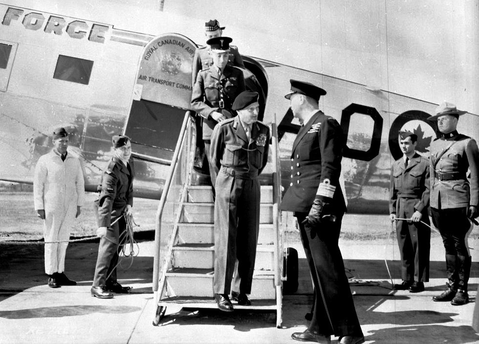 Douglas Dakota, coded AO–, Field Marshal Bernard Montgomery (Monty) being greeted by Vice Admiral ER Mainguy on his arrival in Ottawa, Ontario, 20 Apr 1953.
