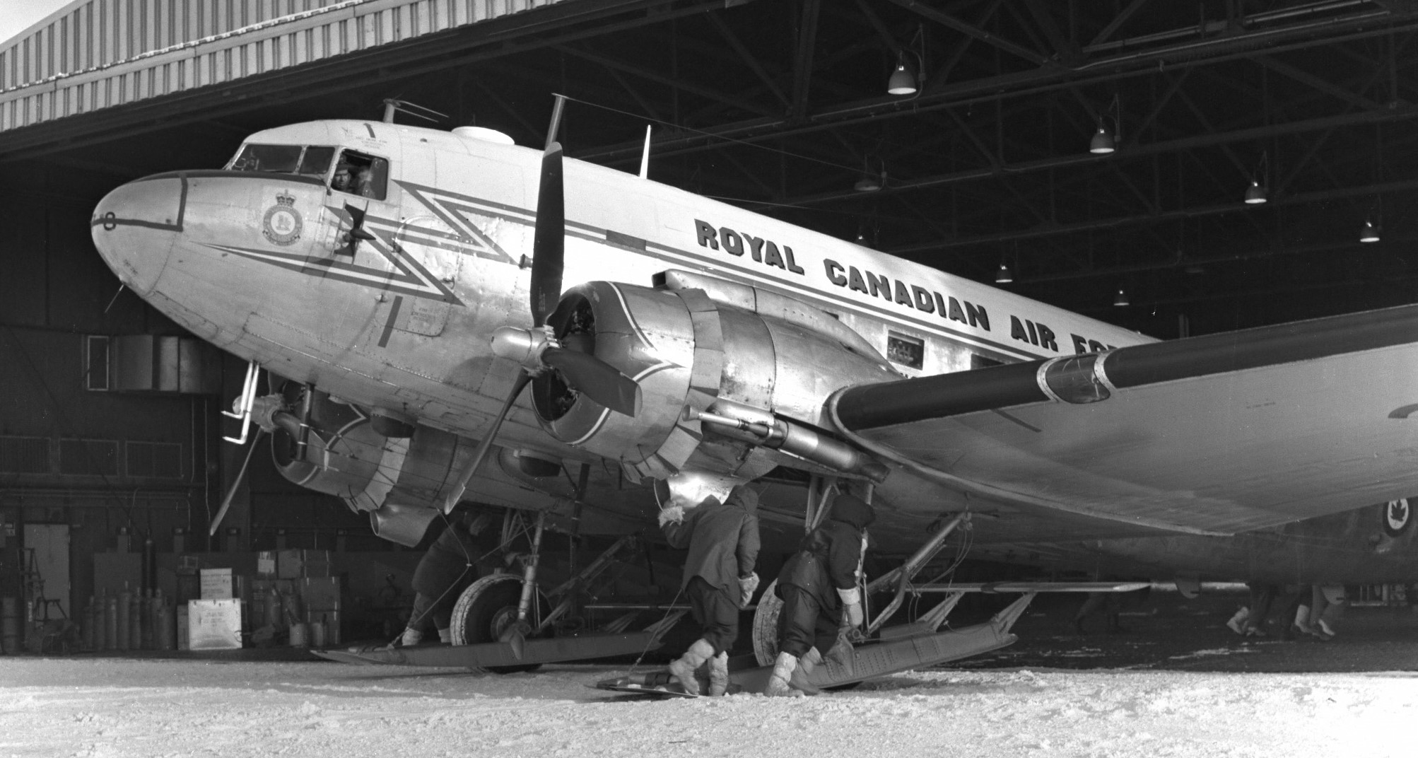 Douglas Dakota on skis,  No. 435 Squadron, based at RCAF Station Namao, Alberta, being pushed into a hangar.