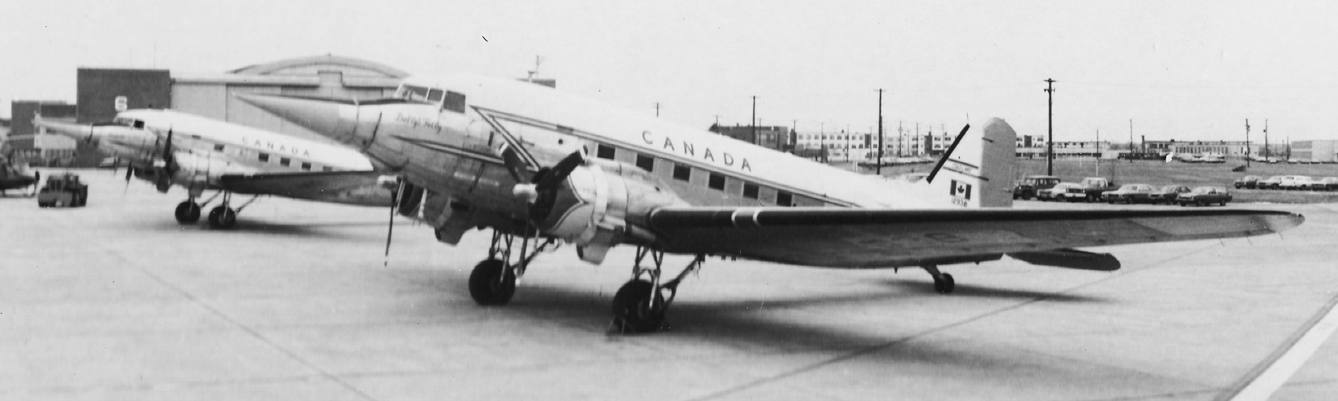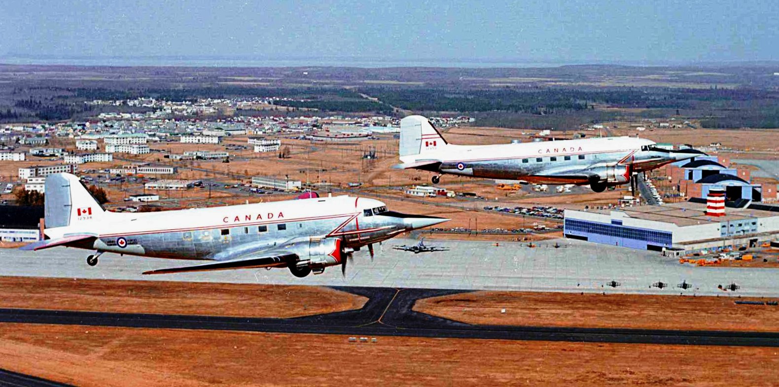 Douglas Dakota (Serial No. 12938),  “Dolly’s Folly” with super-charged engines on the left, and (Serial No. 12959), “Pinocchio” on the right, CFB Cold Lake, Alberta.