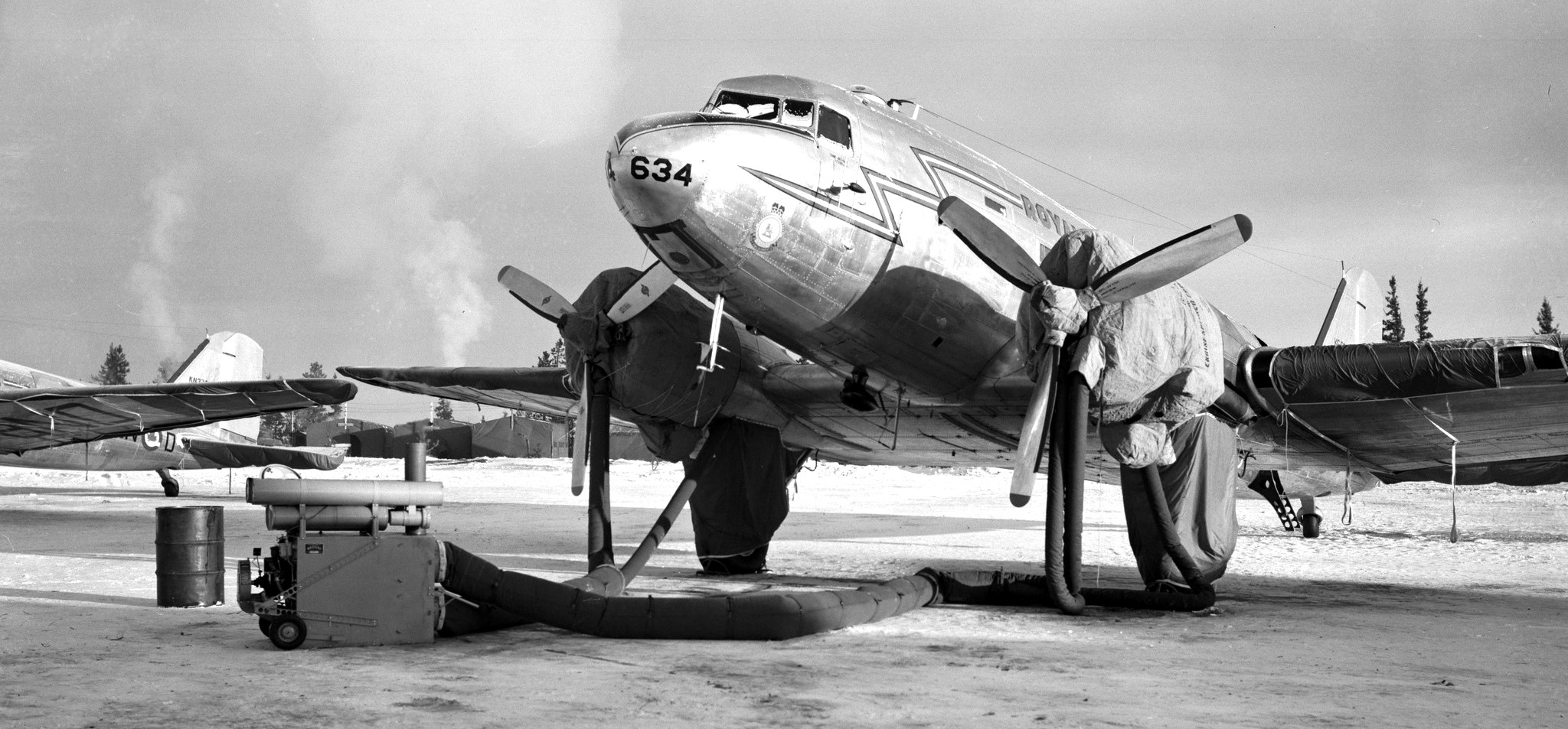 Douglas Dakota (Serial No. KG634), No. 435 Squadron, being warmed up as hot air is pumped in under the engine and wheel well covers. It is also wearing wing covers. A lot of work goes into getting a cold soaked aircraft into the air when a warm hangar is not available. The King’s crown on the squadron crest indicates the photo was taken before 1952.