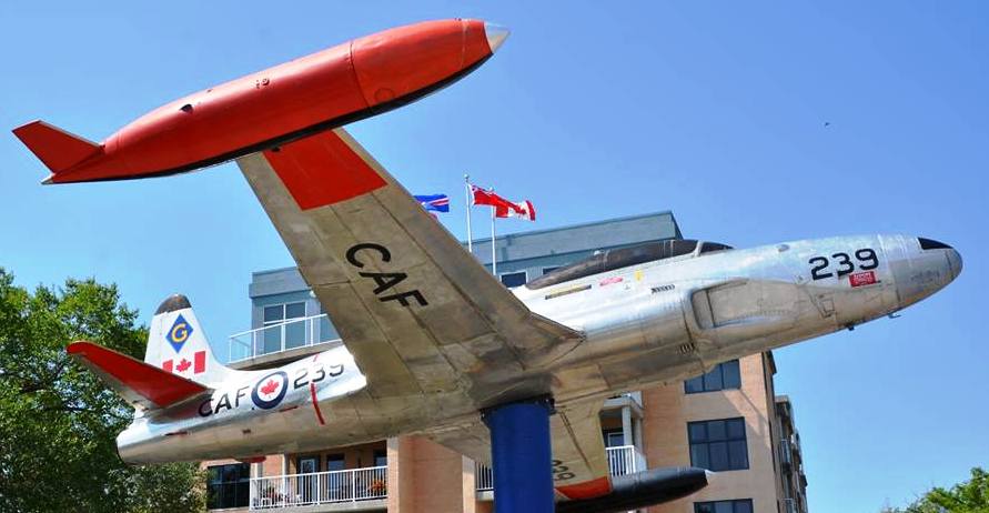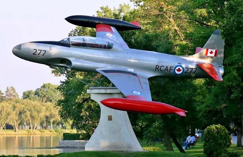 Canadair CT-133 Silver Star (Serial No. 133277), (Serial No. 21277), silver, mounted on a pylon in Island Park.
