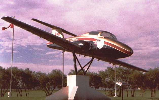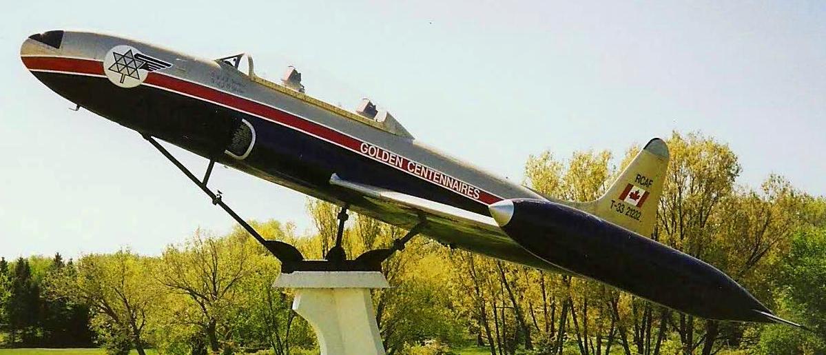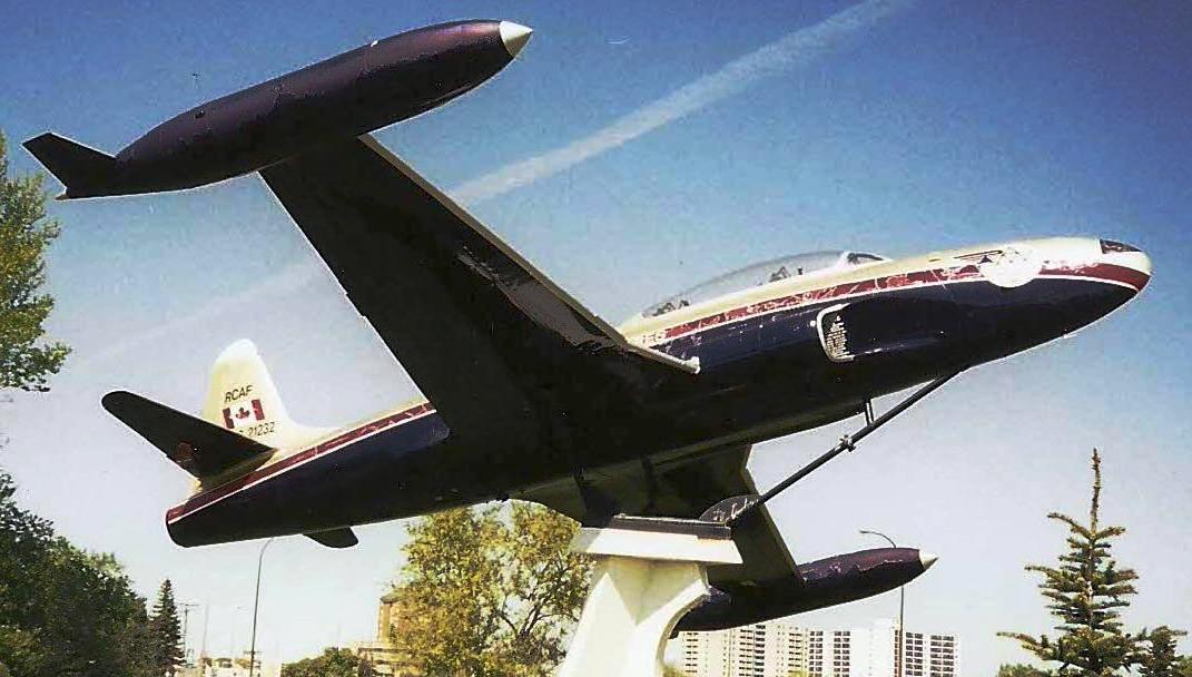 Canadair CT-133 Silver Star (Serial No. 133232), (Serial No. 21232), Golden Centenaires, mounted on a pylon at 500 Wing, RCAFA, Portage Ave. This aircraft has recently been repainted in Red Knight colours.