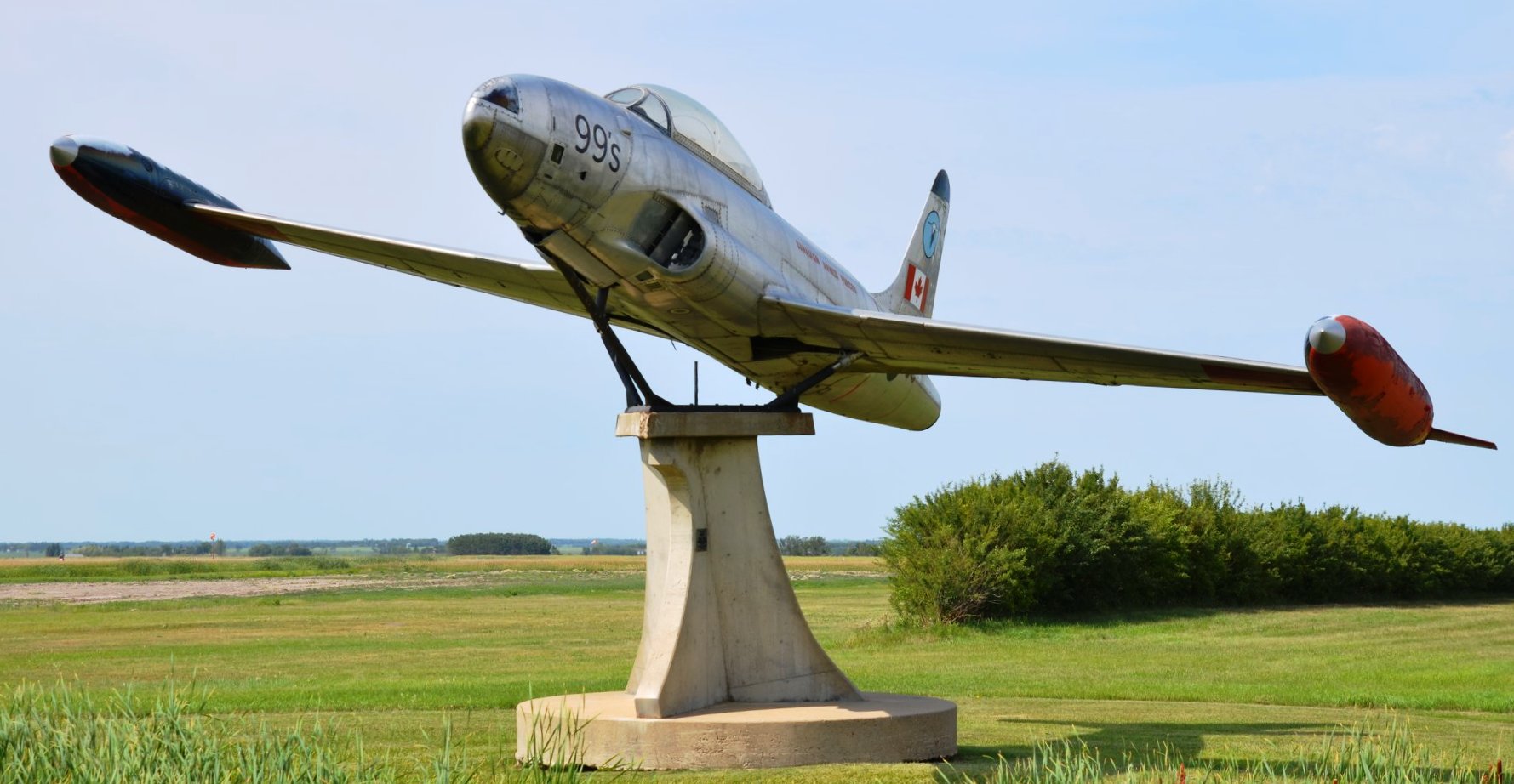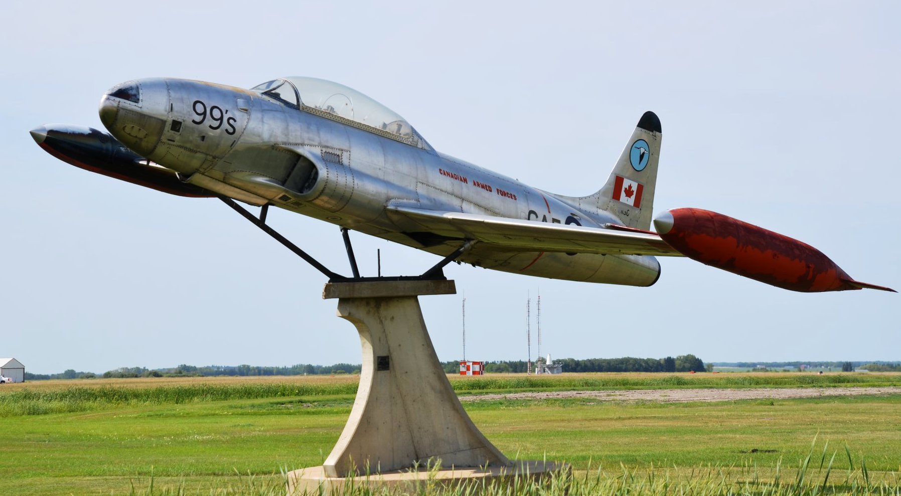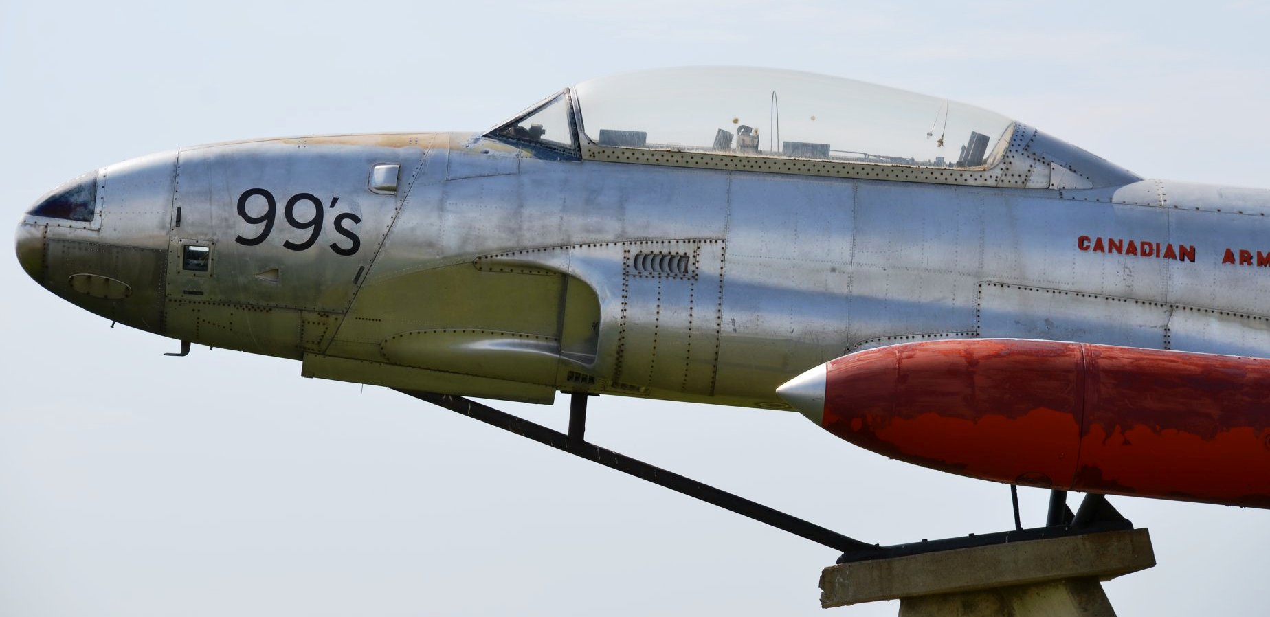 Canadair CT-133 Silver Star (Serial No. 133130), (Serial No. 21130), silver, mounted on a pylon. Brandon Municipal Airport. This aircraft has “99’s” painted on the nose and there is a plaque attached which states: “Presented to McGill field by Western Manitoba Chapter Ninety Nines Inc women pilots in the interest of aviation 5 July 1971.”