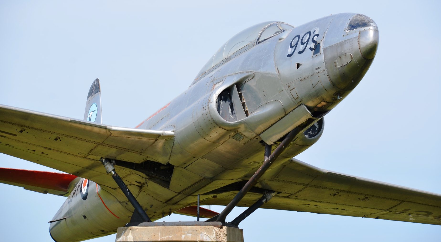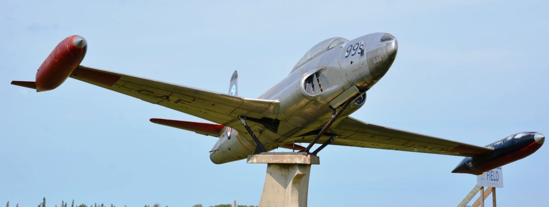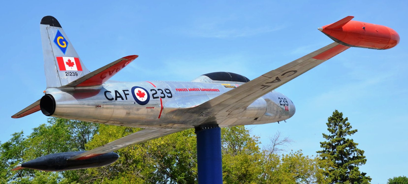 Canadair CT-133 Silver Star (Serial No. 133239), (Serial No. 21239), mounted on a pylon. This aircraft crashed on 6 May 1957, after taking off from Portage La Prairie, Manitoba. The pilot noted the gear was up and the end of the runway was approaching when the engine flamed out. At the end of the runway there was a construction site and a mound of dirt approximately 4 or 5 feet high. The pilot carried out a belly landing sliding along when the left tank hit the mound of dirt ripping the tank off and sending the plane into a spin. Both the instructor and student were able to walk away with minimal bruising. The cause of the flame out was a malfunctioning fuel pump.