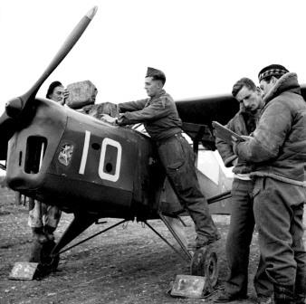 Auster AOP.5 (Serial No. TJ398). Recently acquired for the RCAM and flown to the museum in an RCAF CC-130 Hercules transport from the UK. It is painted to represent a Canadian Army artillery spotting aircraft operating in Italy during the Second World War.