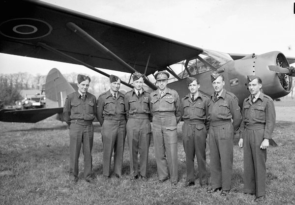 Stinson Reliant, used by General H.D.G. Crerar, shown here with his pilot and ground crew, Grave, Netherlands, 11 Apr 1945.