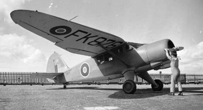 Stinson Reliant, RN (Serial No. FK876), in service with the Fleet Air Arm for training observers at Lee-on-Solent Fleet Air Arm Station in the UK.