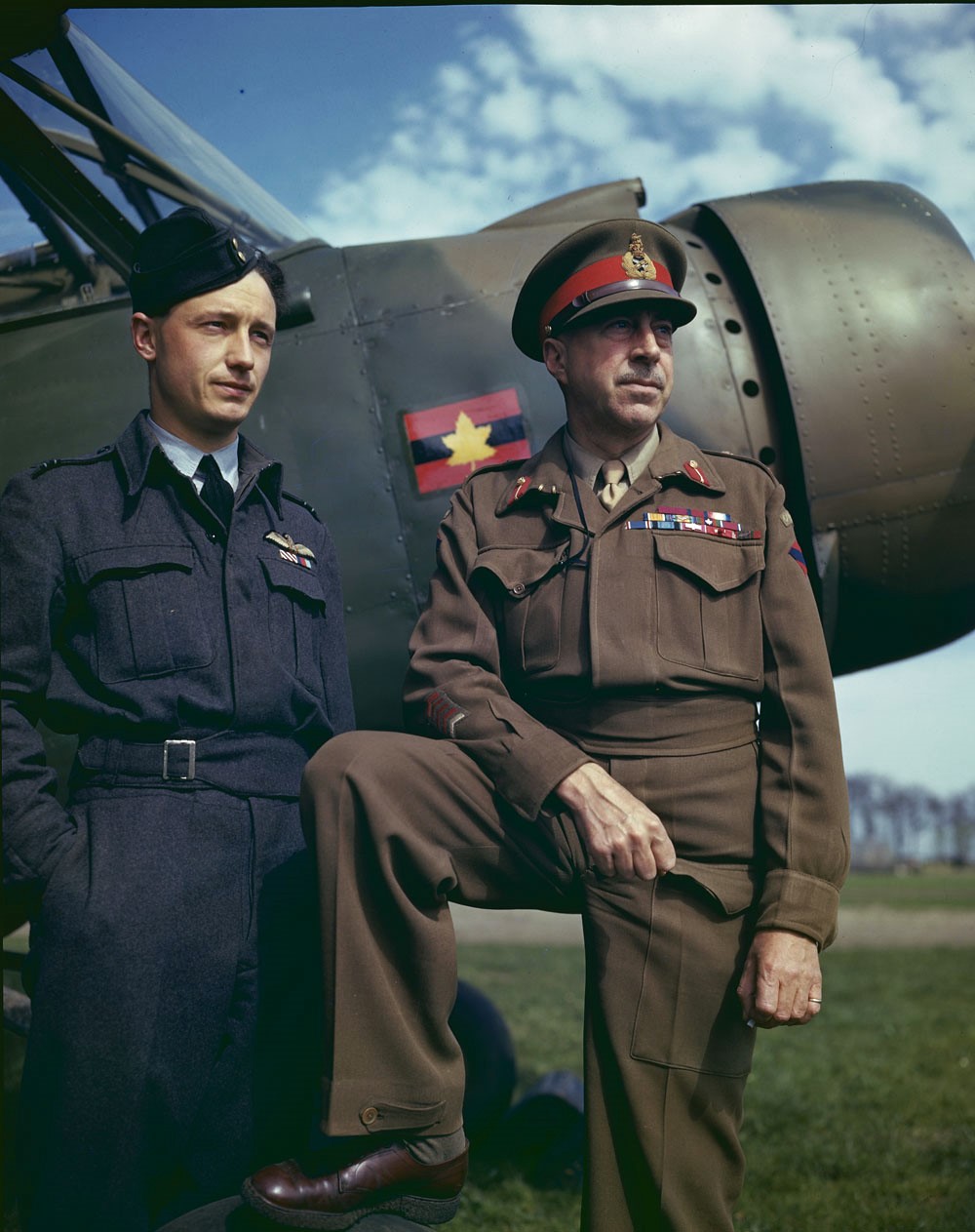 Stinson Reliant, used by General H.D.G. Crerar, shown here with Flt Lt. J. Davis, AFC, 1945.