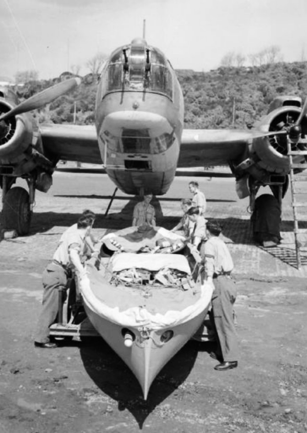 Vickers Warwick ASR Mk. I with a lifeboat being uploaded. These were wooden boats that housed two engines, mast, sails, radio, survival rations and drysuits, as well as an instruction manual on how to sail, and in the later versions could carry ten men. Dropped from a Warwick at 700 feet (210m), the Fox boat would drift down on six parachutes and when it hit the water would shoot out lifelines on rockets for the downed crew to grab onto and board the boat to await rescue, or else make their own way back to shore.