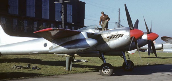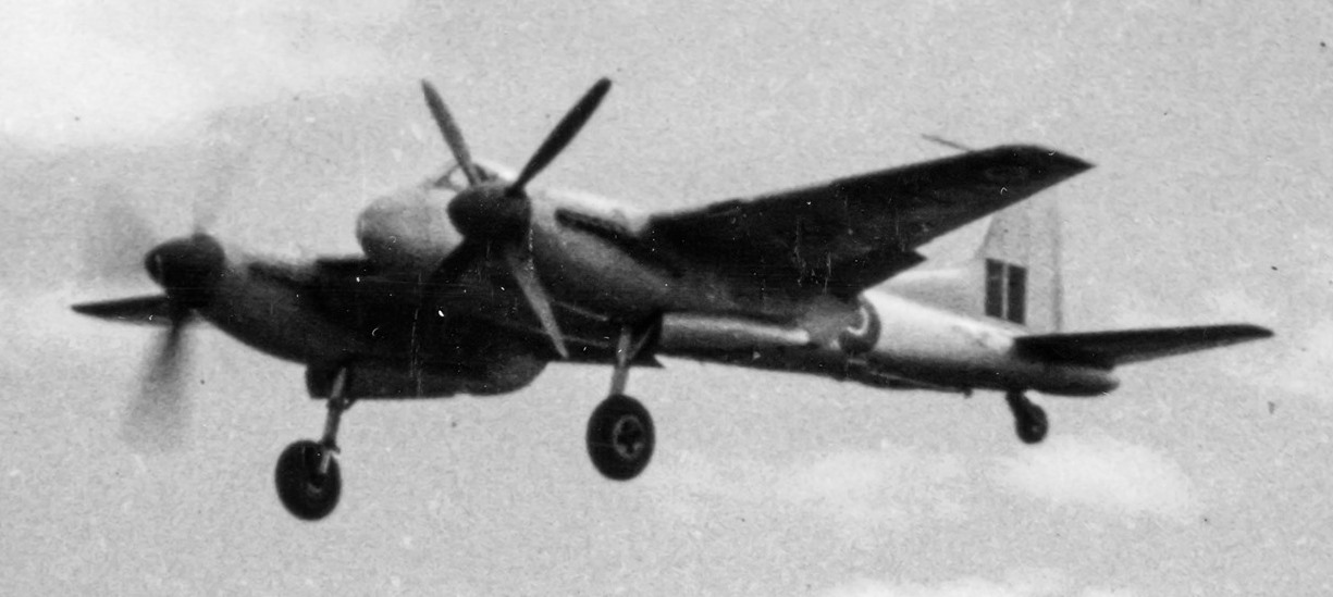 The Hornet NF.21 was designed to fill a need for a naval night fighter. Special flame-dampening exhausts were installed, and a second basic cockpit was added to the rear fuselage, just above the wing trailing edges. ASH radar equipment was placed in the rear of this cockpit, with the radar operator/navigator seated facing aft. To gain access, a small trapdoor was provided in the lower fuselage; a fixed, teardrop-shaped bubble canopy, which could be jettisoned in an emergency, provided a good field of view. At the front of the aircraft, the nose underwent a transformation with the small rotating ASH radar dish being housed under an elongated “thimble” radome. The horizontal tail units were increased in span. The effect of these modifications on performance was minimal; about 4 mph (6 km/h). (Wikipedia)