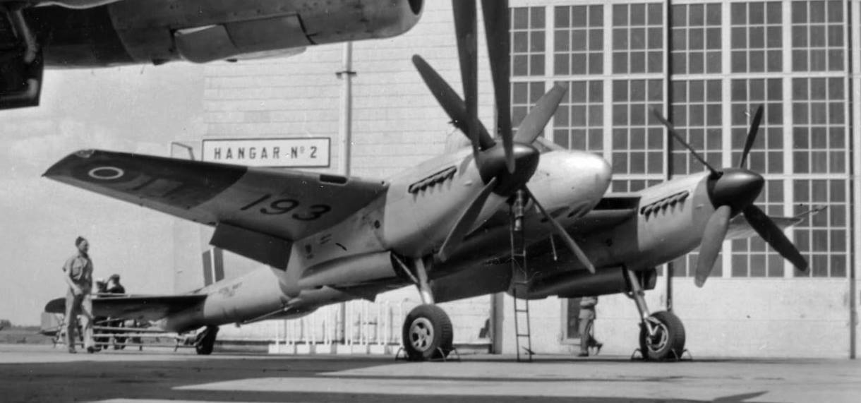 de Havilland DH.103 Sea Hornet F. 20, RN (Serial No. TT193). No. 1 engine shutdown and the prop feathered.