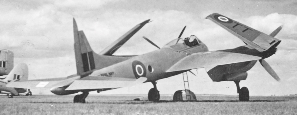 The Hornet was designed with the possibility of naval service on carriers firmly in mind. To this end good low-speed handling was required, along with good all-round visibility for the pilot. The basic Hornet design excelled at meeting these requirements. Shortly after the first Hornet prototype flew, Specification N.5/44 was issued to de Havilland, covering the modification of the Hornet for naval service. The Heston Aircraft Company was contracted to carry out the conversion work on three early production F.1s. The work entailed altering the wings to incorporate folding mechanisms so that each outer wing panel, from the aileron/flap line outboard could be folded upwards and inwards at an angle. The hinges were part of the upper wing skin structure while the lower wing skins incorporated securing latches, and Lockheed hydraulic jacks were used to move the wing panels. Slotted flaps were introduced to improve low speed “flaps down” control.