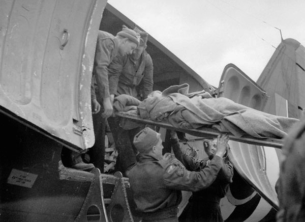 Wounded being evacuated by Douglas Dakota, from the Royal Air Force’s No. 1680 Transport Flight, Normandy 1944.