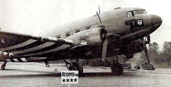 Douglas C-47 Skytrain, USAAF (Serial No. 223934), delivering RCAF fighter squadron groundcrew in Normandy, 16 June 1944.  There is a story that this Dakota was a USAAF used by Field Marshal Montgomery around the time of D-Day.  He apparently won it and its crew in a card game!  Note the Union Flag, small fin flash and appropriate star rank markings, although it retained USAAF national insignia.