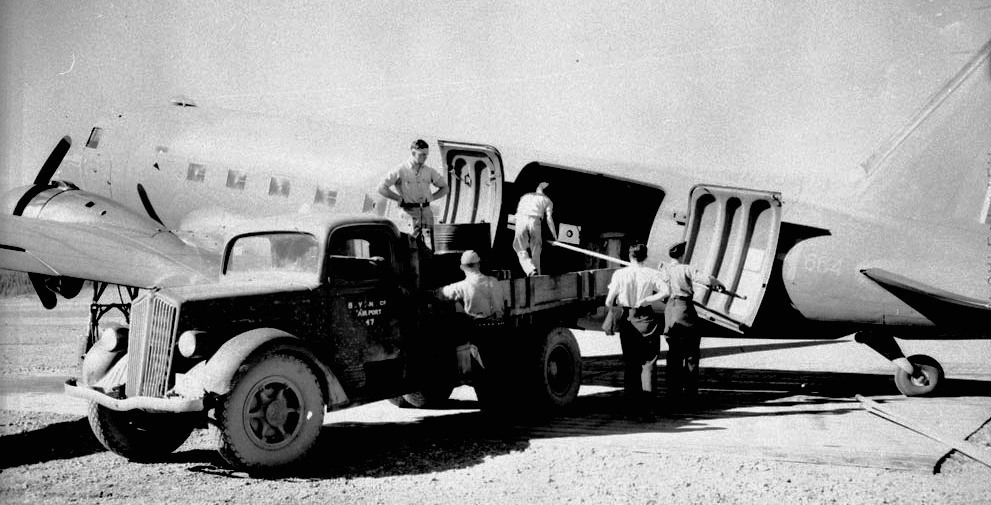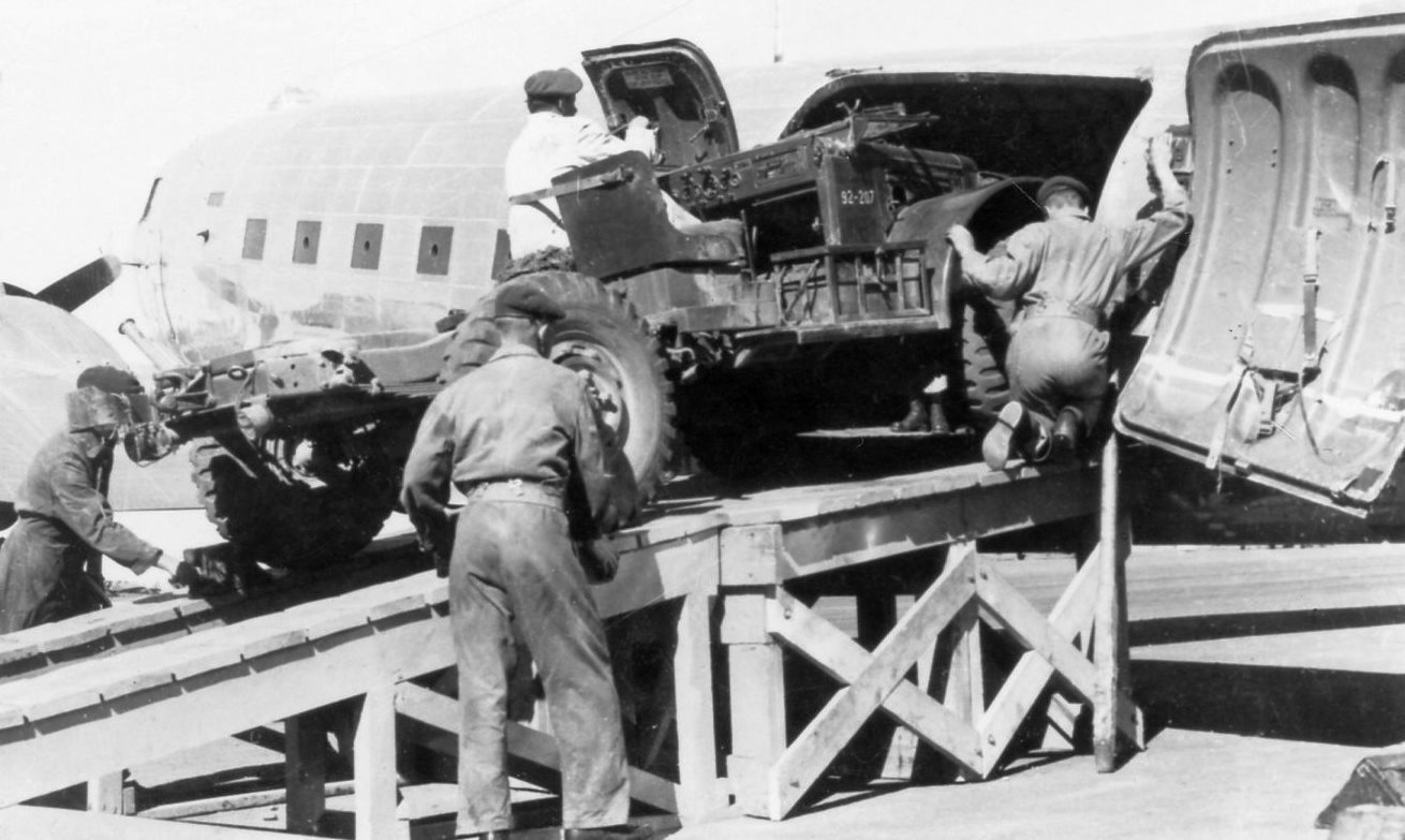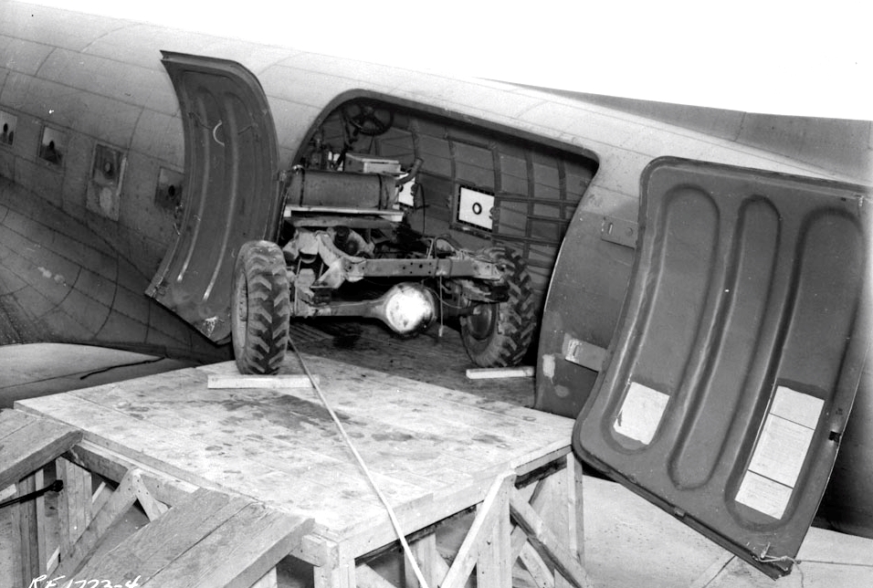 Douglas C-47 Dakota with a Dodge D3/4APT 4X4 being loaded. The cargo box has been removed for this loading.  The APT stood for “Air Portable”. “Airportable” referred to vehicles that could be transported whole or knocked down (i.e. partially dismantled) to fit in an aircraft. This was a useful pioneer concept to fly vehicles into remote locations. A slight distinction is that “Airborne” vehicles were carried intact and ready for combat as soon as they had landed. These could be driven straight out of the glider or motorized transport aircraft (after such a/c had been developed), dropped by parachute or lifted in by helicopter. Canada has continued to use aircraft to transport vehicles, sometimes to overseas locations. Ferret Scout Cars and M series jeeps and 1/4 Ton trailers for example in the 1950s-1960s. The jeeps and trailers could be fitted with hold-down “D” rings on the underside of the chassis. Now with large transport aircraft with “roll on, roll off” capability (to use a shipping term) can carry large tanks, helicopters etc. (Colin MacGregor Stevens)