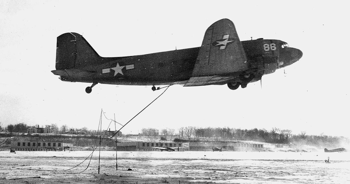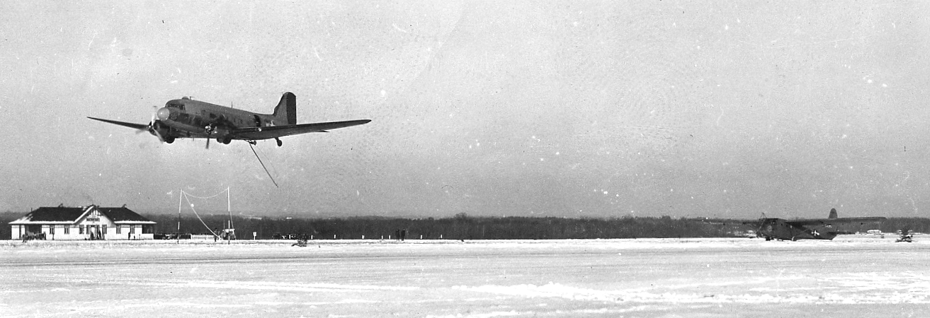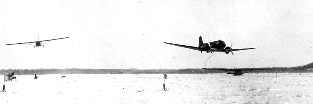 USAAF Douglas C-47 Skytrain, about to tow a WACO glider at Rockcliffe, Ontario, 1947.  From a photo album given to the British Columbia Air Museum, that belonged to Gordon Franklin Snider, who was posted at Patricia Bay, BC.  He also was posted to the Experimental Proving Establishment at Rockcliffe, Ontario, in 1947, where he took this photo.