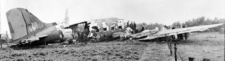 Operation MARKET III: air re-supply of British airborne forces in the Arnhem area, 19 September 1944. Burnt-out Douglas Dakota Mk. III (Serial No. KG401), of No. 48 Squadron, RAF, based at Down Ampney, Gloucestershire, which crash-landed in a field near Kessel, Holland, after parachuting supplies over Arnhem.  The aircraft had just dropped its supplies from 700 feet when it was met with intense anti-aircraft fire.  The tail unit, rudder, port aileron and engine, the starboard auxiliary fuel tank and all the gyro instruments were either damaged or put out of action, and one of the Army despatchers was mortally wounded. The captain, Flying Officer L.R. Pattee, RCAF, and his co-pilot, Flying Officer A.C. Kent, RAF, flew the crippled aircraft back to the British lines, through three more areas of enemy flak, where they sustained further serious damage, including a five foot hole in the starboard wing which caught fire, and complete electrical and communications failure.  Once over the British lines, Pattee gave the crew and despatchers the opportunity to bale out, but they refused and the pilots then made a successful belly-landing in the field.  No sooner had they all quit the Dakota, than it was engulfed by flames.  The unfortunate despatcher died soon after the landing, while the others were taken to Brussels and the crew returned to Down Ampney.  Sixteen aircraft of No. 48 Squadron participated in MARKET III, flying through intense flak with no fighter escort.  Many aircraft were hit and two, (KG401 and KG428), failed to return.  Over the following four days the Squadron lost another six Dakotas on re-supply missions to Arnhem.