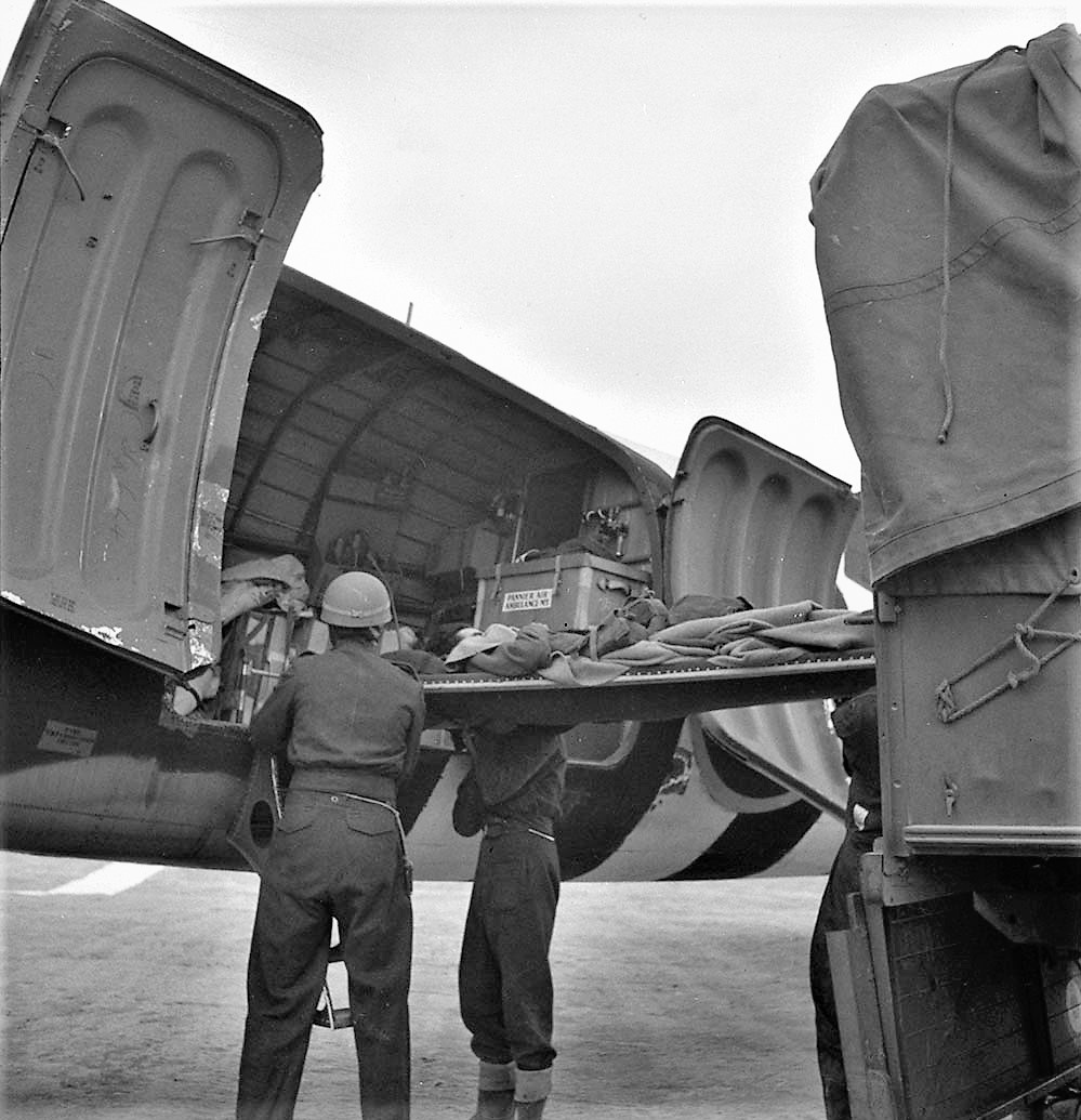 Wounded soldier being transferred from army truck to Douglas Dakota Aircraft during casualty evacuation operation, 16 June 1944.
