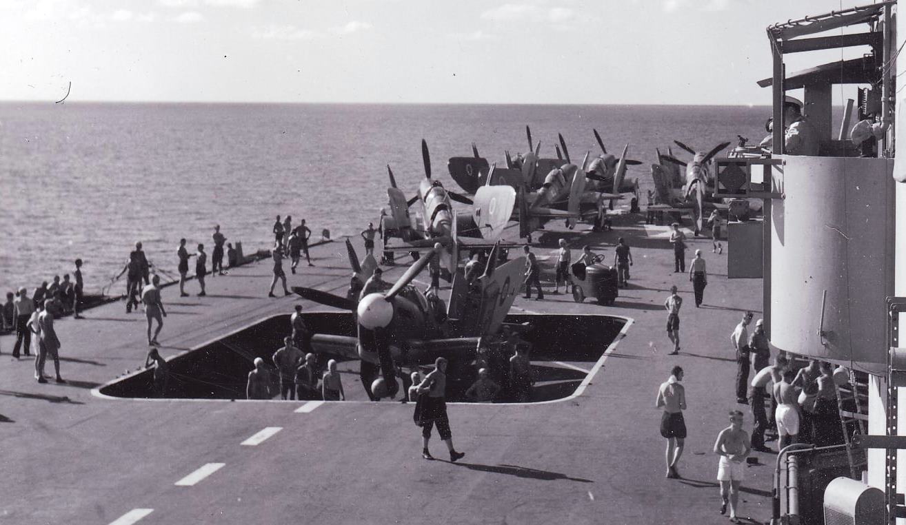 Hoisting and ranging aircraft in preparation for flight ops, HMCS Warrior, Caribbean circa 1947. British-design carriers mounted hangar elevators on the ship’s centerline, through the flightdeck. This kept the ship relatively stable as the centre of gravity shifted, particularly in rough weather. (In contrast, USN carriers moved aircraft elevators to the ships sides.)  (Photo from J. Tyre collection)