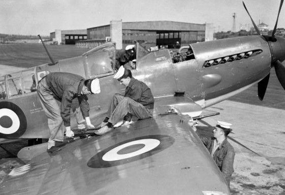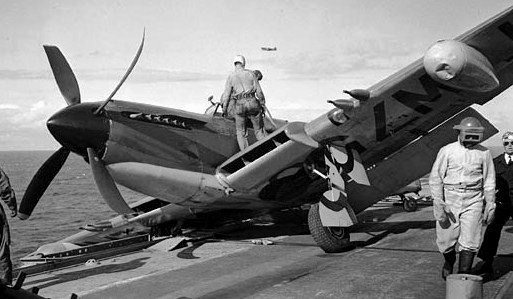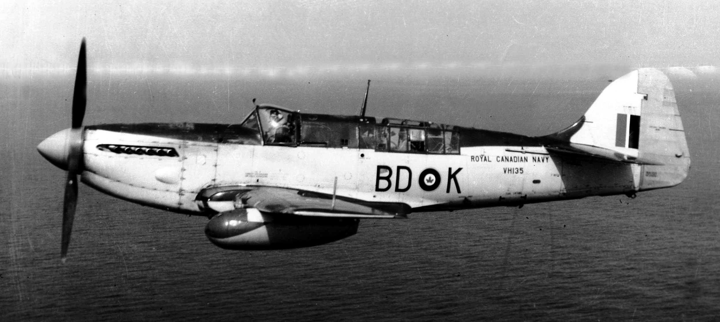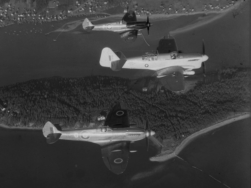 RCN Supermarine Seafires with a Fairey Firefly, over MacNab’s Island and the entrance to Halifax Harbour, 25 November 1947. Seafire (Serial No. PR451), coded P (top) flying in No. 803 Squadron. It and would eventually fly with No. 883 Squadron coded as VG-AA-J, and it survives today in the Military Museums, Calgary.